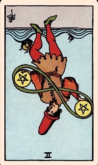 Expect life to make a few waves today. The best way to handle this unpredictability is with flexibility and good humor. Remember not to fight through the waves, but to sail over them. Sometimes, the Two of Pentacles reversed heralds seemingly disappointing situations that end up being blessings in the long run. Be flexible today.....the random occurrences you encounter will only be an issue if your expectations remain fixed. On the most basic level, this card can simply indicate a need to confront financial situations that need your attention and get them organized and in order.