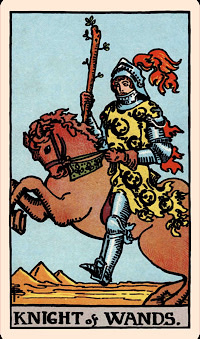 The Knight of Wands symbolizes the urge for exploration and adventure. He is the traveler of the tarot (here he is pictured visiting Egypt). He understands that by removing himself from the humdrum routines of day to day life he can gain better perspective of who he really is. A free and fearless spirit.