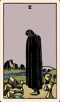 The Five of Cups symbolizes the trance-like state of focusing only on the negative, even when there are so many blessings around. The figure on the card gloomily stares at three spilled cups. He fails to notice the two perfectly upright cups still standing behind him. This card shows that just because everything in your life isn’t “perfect,” doesn’t mean that you need to feel bad about it all day....month...........year...................decade!