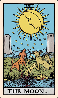 The Moon beams brightly in the sky pulling on the instincts of the animals on the card, in very mysterious ways. A wolf appears in the image, howling at the moon. The wolf represents the primitive, instinctual side of your nature. A domesticated dog also appears alongside the wolf. The dog represents your "civilized self."
