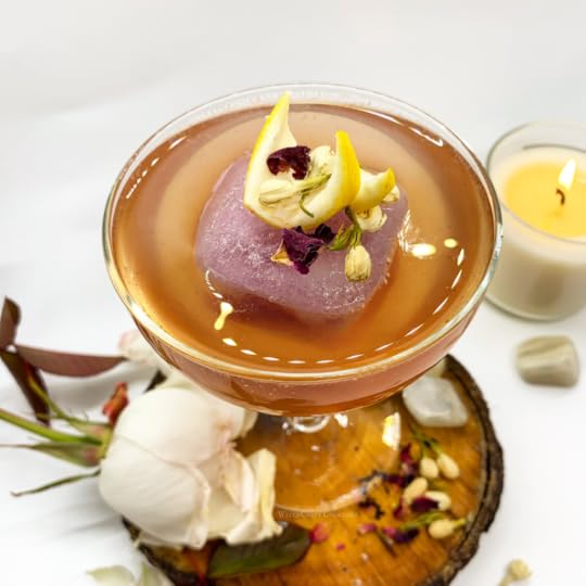 InstructionsIn your cocktail shaker, add all ingredients together. You may also wish to add some apple cube pieces, for extra healing and love magic. Add ice, and shake the ingredients together. Strain into a coupe glass. Garnish by curving a wide lemon peel so that it floats like a boat, and nestling dried jasmine and rose petals inside.