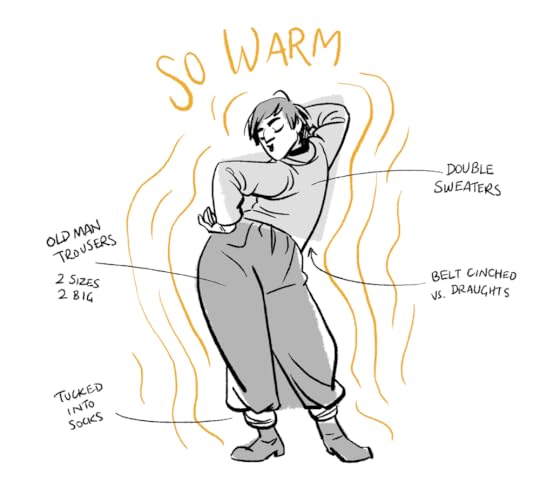 There are roughly two types of cold: dry and damp. The influential factor is water, because it takes a tremendous amount of energy to make water change temperature – this is why it takes so much power to boil a kettle, and why we bring hot water bottles to bed instead of hot gravel bottles. In dry environments, there is less water vapour in the air to suck up the heat coming off your body, so you get to keep more of it for yourself. It may be well below freezing, but you will feel the cold merely as a sensation on your skin, where it meets the air, and not something that goes right through you. Damp cold, because of the energy-hungry water in the air, feels a lot colder. It’s not enough merely to cover your skin, you need layers of fabrics that have moisture-repelling properties (wool is key; cotton is useless). Your precious body heat will leak out through any weak point in your clothing. Because of their different properties, dry air can be much colder than damp air and yet feel more comfortable. In my experience, damp cold is the worst when it’s above freezing, because below freezing the air can’t hold so much water. Damp climates, however, tend not to get much below freezing, so when people from damp climates imagine very cold temperatures, they imagine the insidious cold they know, only much much worse. It’s not necessarily like that.