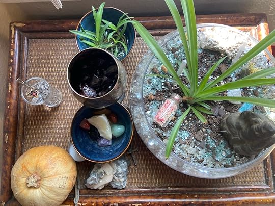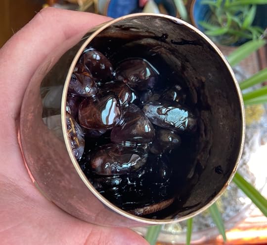 This afternoon I broke my mini altar down and dropped all my rune stones in the “blood”. Then I set it with some plants that I’m thinking about using in my altar. I’ll leave the stones in the chalice until full moon and see what happens.