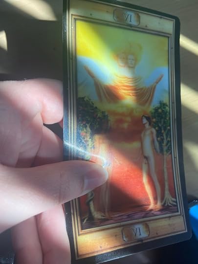 So I pulled out a Tarot deck and drew a card: the holographic lovers card. The way the light hit the card, it made it look like Raphael had 2 heads — twin souls again.