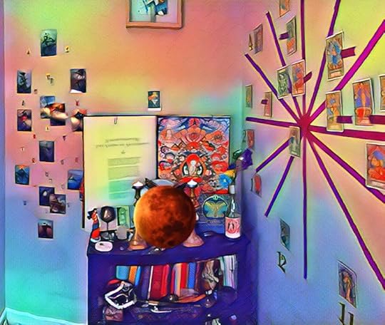 Since any it’s an eclipse, I follow the old-school idea that you shouldn’t do too much heavy duty magical working during this time. According to older philosophies, eclipses block spell work. But I have been working on my alchemist corner and covering my walls with charts like a mad woman. But there’s a method to the madness. Just like William Faulkner who wrote the outline for The Sound and the Fury on his walls or scientists who cover walls of chalkboards with mathematical equations, I built my astrology clock and mapped out the Tree of Life so that I have my charts big and ready to interact with in my tiny study. I also build a simple altar (I did all of this one handed because I broke my arm!). But my only intention is that some flower seeds that I planted around the neighborhood in little patches of overgrown weeds down allies and in the park grow and bloom and make my neighborhood prettier.