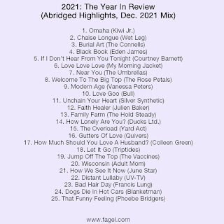 Yes, I got an itchy trigger finger and burned my annual year-end mix a few weeks early. Hopefully there won't be any great new releases in the last few weeks of the year. That said, I always circle back after year-end with a personal 2-CD mix that picks up the stuff that didn't make the cut, some last-minute entries, and music I only discover through others' year-end mixes. (You can see all my annual mixes from 1966 to the present on my home page.)