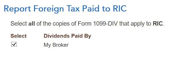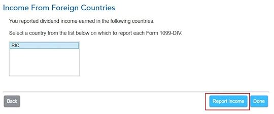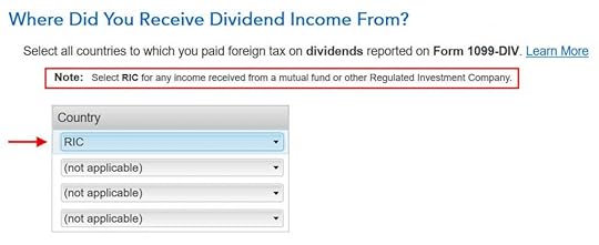 The “learn more” popup says you should choose “RIC” as the country when your foreign income came through mutual funds and/or ETFs. “RIC” is the last item in the country dropdown.