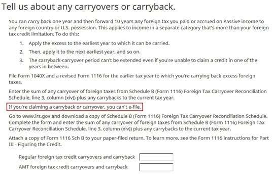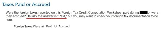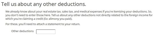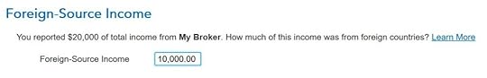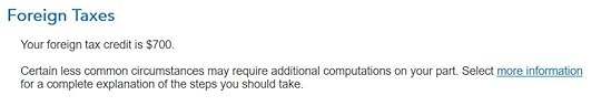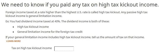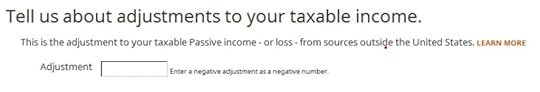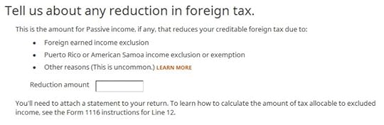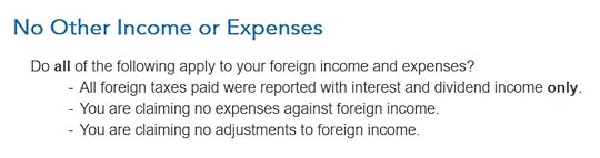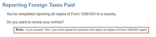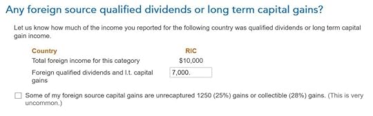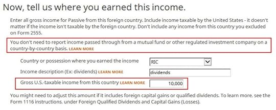 Don’t overlook the small note under the gross income input. It says you might need to adjust the amount if it includes foreign capital gains or qualified dividends. When you’re reporting foreign taxes paid from mutual funds and ETFs, the income sure does include qualified dividends. H&R Block doesn’t do the adjustment for you. It asks you to read the IRS instructions, learn how to adjust, and report the adjusted income here. That’s lazy.
