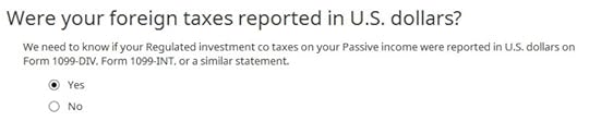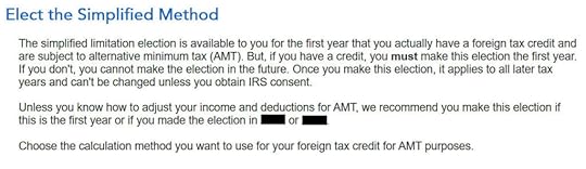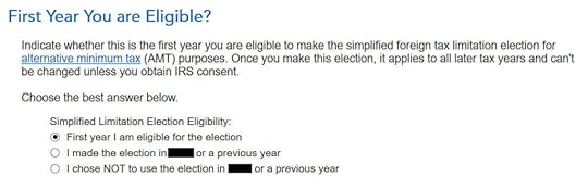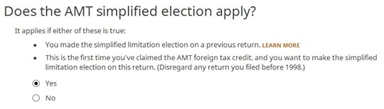 If this is the first year you’re claiming the Foreign Tax Credit, H&R Block software asks upfront about the simplified election. Select “Yes” for the simplified election.