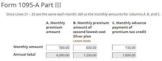 Enter the monthly amounts from the 1095-A. The full unsubsidized premium was $500/month. The full unsubsidized premium for the second lowest cost Silver plan was $600/month. The ACA healthcare marketplace paid $150/month in advance subsidy to the insurance company on our behalf.
