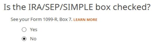 Self vs SpouseIf you are married, make sure you don’t have the 1099-R and the IRA contribution mixed up between yourself and your spouse. If you inadvertently assigned two 1099-Rs to one person instead of one for you and one for your spouse, the second 1099-R will not match up with a Traditional IRA contribution made by a spouse. If you entered a 1099-R for both yourself and your spouse but you only entered one Traditional IRA contribution, you will be taxed on one 1099-R.