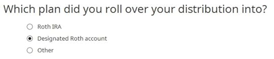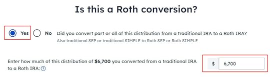 It asks you about Roth conversion. Answer Yes to conversion and enter the converted amount. This whole 1099-R is the result of a Roth conversion.