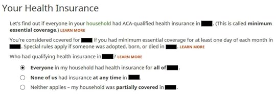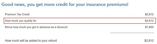 TurboTax crunches the numbers in a split second. It says we’re eligible for more tax credit than the ACA healthcare marketplace already paid directly to the insurance company. We’ll get the difference in our tax refund.