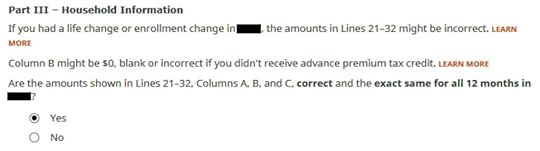 Enter the information as requested. Scroll down to Part III. The numbers on our 1095-A are the same for all 12 months and correct in our example. If you have different numbers for some months, choose ‘No’ and enter the month-by-month numbers from your Form 1095-A.