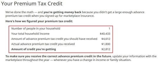 The software crunches the numbers. It says we are eligible for more premium tax credit than the advance subsidy the ACA healthcare marketplace already paid to the insurance company.