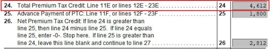 Scroll down to Line 24 on Form 8962. That’s our premium tax credit based on our actual income. Because we received less in advance subsidy, we’re getting the difference in our tax refund. If you received more in advance subsidy, you’ll have to pay back the difference (subject to a cap, see Cap On Paying Back ACA Health Insurance Subsidy Premium Tax Credit).