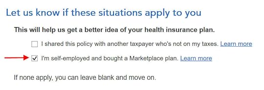 This is important but easy to miss. Even though TurboTax knows you’re self-employed and you have the 1095-A form from the ACA healthcare marketplace, you still must check this box.