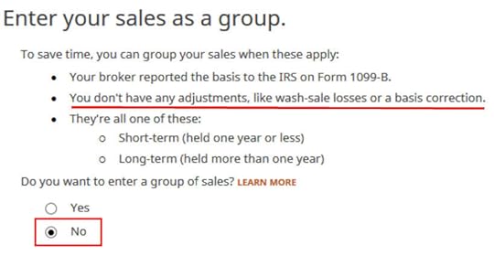 This is another important question. If you are doing it the easy way as in our example, technically you can answer Yes and skip some questions. The safer bet is to answer No and go through the follow-up questions. If you’ve been going through these screens back and forth, you may have put in some incorrect answers in a previous round. You will have a chance to review and correct those answers only if you answer No.