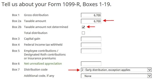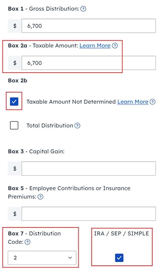 If you imported your 1099-R, double-check to make sure the import exactly matches the copy you received. If you enter your 1099-R manually, be sure to enter everything on the form exactly. Box 1 shows the amount converted to the Roth IRA. It’s normal to have the same amount as the taxable amount in Box 2a when Box 2b is checked saying “taxable amount not determined.” Pay attention to the distribution code in Box 7. My 1099-R has code 2.