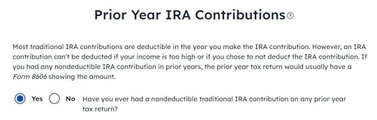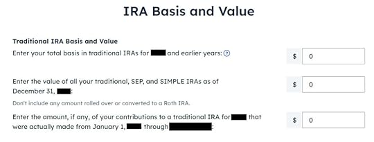 It asks you about the basis carried over from previous years. If you did a clean “planned” backdoor Roth every year, you can answer “No.” If you have gone back and forth before you found this guide, some of your previous answers may be stuck. Answering “Yes” here will give you a chance to review and correct them. If you have a number on line 14 of Form 8606 from your previous year’s tax return, answer Yes and enter it.