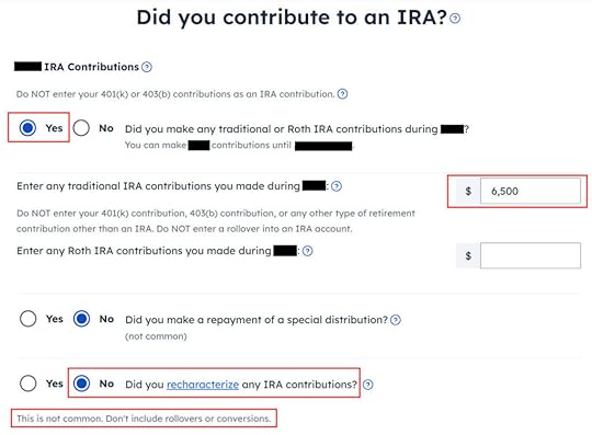 Answer Yes to the first question and enter your contribution. Leave the answer to “Did you recharacterize” at No. In our example, you contributed $6,500 directly to a Traditional IRA. If you originally contributed to a Roth IRA and then you recharacterized the contribution as traditional contributions, enter the amount in the Roth IRA box and choose Yes below when it asks you whether you recharacterized.