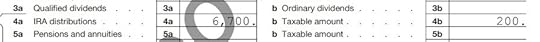 It shows $6,700 in IRA distributions in line 4a and only $200 is taxable in line 4b. If you are married filing jointly and both of you did a backdoor Roth, the numbers here will show double.