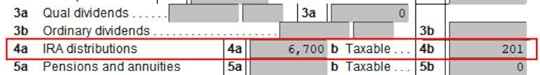 It shows $6,700 in IRA distributions, $201 of which is taxable. The taxable income came out to $201, not $200, due to some rounding in the calculation. If you are married filing jointly and both of you did a backdoor Roth, the numbers here will show double.