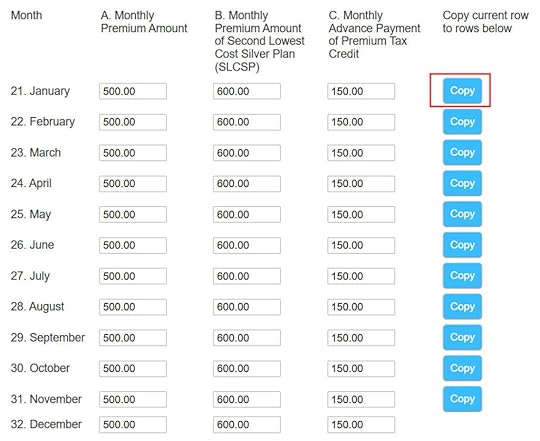 Enter the premium numbers from your Form 1095-A. If the numbers are the same for all months, enter the row for January and click on the Copy button next to it. It will put the same numbers for all other months.