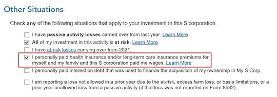 Be sure to check the box “I personally paid health insurance …” even if the S-Corp paid it directly.