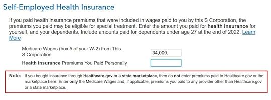 Enter the Medicare Wages from Box 5 of your W-2 from the S-Corp. Read the note carefully. Leave the second box blank if the S-Corp only paid for an ACA marketplace health insurance policy. Enter a number for any policy paid outside the ACA marketplace, such as any dental or vision premiums.