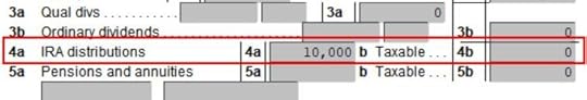 It shows the withdrawal amount on Line 4a and zero on Line 4b. A zero on Line 4b means it’s tax-free. If you have other IRA distributions such as RMDs on Lines 4a and 4b, this Roth IRA withdrawal adds to your other distributions on Line 4a but it doesn’t add to the taxable amount on Line 4b.