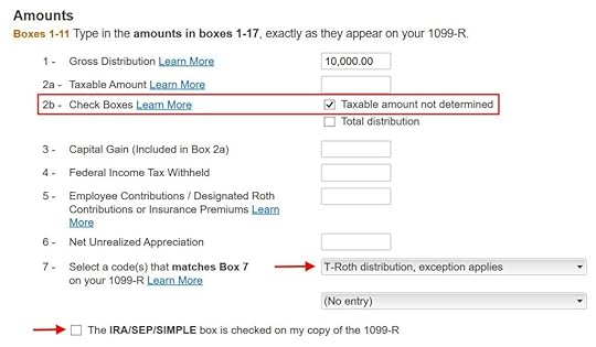 Box 1 shows the amount taken out of the Roth IRA. You may have the same amount copied as the taxable amount in Box 2a. That’s OK when Box 2b is checked saying “taxable amount not determined.” Pay attention to the code in Box 7. Make sure your entry matches your 1099-R exactly. I have a code “T” in my test 1099-R. The IRA/SEP/SIMPLE box is not checked because it’s from a Roth IRA.