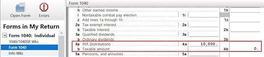 We can see how this shows up on the tax form. Click on Forms on the top and open Form 1040 and Schedules 1-3. Click on Hide Mini WS. Scroll down to lines 4a and 4b.