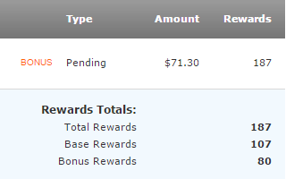 For example, $71.30 purchase earned 187 reward points worth $1.87. That’s 2.625%. You get the 75% bonus after you qualify for the Platinum Honor tier in Preferred Rewards. If your Bank of America checking account is new, it has to go through three month-ends before you qualify.