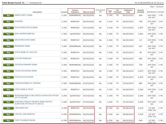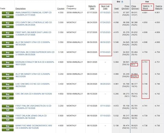 If we want to buy $50,000 worth of CDs, that CD from Cross River Bank only has $48,000 available. We’ll have to mix and match or go down to the next one from Discover Bank for a slightly lower yield at 4.754%. Either 4.772% or 4.754% still has to be reduced by the trading commission we must pay for buying secondary CDs.