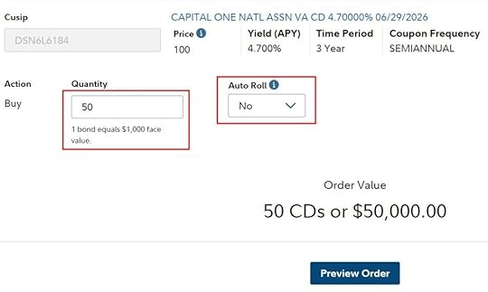 It doesn’t matter that the CD is from a bank we haven’t heard of because it has FDIC insurance. We also must buy in $1,000 increments. We enter 50,000 in the quantity box. Vanguard doesn’t offer an “Auto Roll” feature. We can set a reminder in Google Calendar to reinvest when our CD matures.
