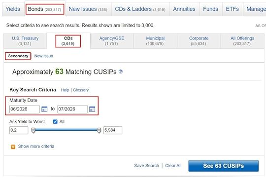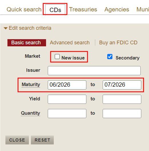 Click on the “CDs” tab. Uncheck the box for “New issue” and check the box for “Secondary” because we’re looking for secondary CDs. Enter a date range for the maturity date and click on “Search.”