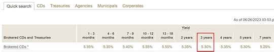 3-year CD directly from a credit union5.13%3-year Treasury4.7% (tax-equivalent), 4.3% in IRA3-year new issue non-callable brokered CD4.7%3-year secondary non-callable brokered CD4.7%Given these rates, if we prefer the convenience of keeping everything in the brokerage account, we’ll buy a 3-year Treasury note (see How To Buy Treasury Bills & Notes Without Fee at Online Brokers and How to Buy Treasury Bills & Notes On the Secondary Market). We’ll buy a CD directly from a credit union for a slightly higher yield if we don’t mind opening a new account there. If we’re buying in an IRA, we’ll consider a new issue brokered CD but we have to weigh it against the poor liquidity. Buying a brokered CD on the secondary market doesn’t give us a meaningful bargain at the moment we looked.