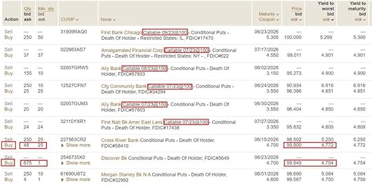 We look carefully to skip the callable CDs. The second row in the “Yield to worst” column shows the yield when we buy. The search results show that the highest yield available in a non-callable CD on the secondary market is 4.772%. The second row in the “Qty” and “Min. qty” columns shows how much is available and the minimum purchase amount. 48 under “Qty” means $48,000 in face value is available and 25 under “Min. qty” means we must buy at least $25,000 in face value. The second row in the “Price” column shows the price we must pay. We want to see a number below 100 to get full FDIC insurance.