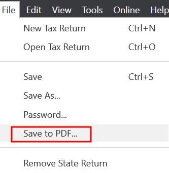 Print or Save to PDFWhen you’re done entering everything into TurboTax, it’s a good idea to print the tax forms or create a PDF file with all the forms as a draft. You should review the forms carefully and compare them with the previous year before you file. After you review everything and e-file, you should save the final filing to a PDF file for your records. TurboTax download software has a handy menu option for that: File -> Save to PDF.