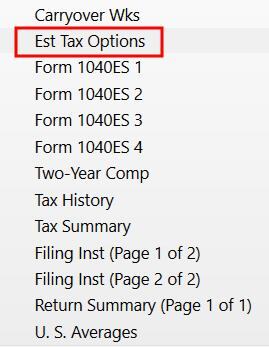 Scroll down and click on “Est Tax Options” near the bottom of the list of forms on the left.