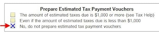 Scroll down on the right to find the heading “Prepare Estimated Tax Payment Vouchers” in the middle of the form. Check the option “No, do not prepare estimated tax payment vouchers.”