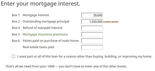This can’t be right. We entered a beginning balance above $1 million on the 1098 form. H&R Block didn’t ask for the home purchase date to see whether the limit is $1 million or $750,000. It didn’t ask for the ending balance or the interest rate to calculate the average mortgage balance. H&R Block just uses the interest paid number from the 1098 form as if the loan limit doesn’t exist.