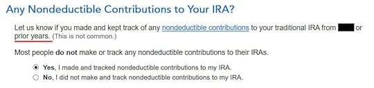 Here it’s asking about the prior year carryover. When you’re doing a clean “planned” Backdoor Roth as in our example — contribute for year X in year X and convert before the end of year X — you can answer No here. If you contributed for the previous year between January 1 and April 15 during year X, answer Yes here.