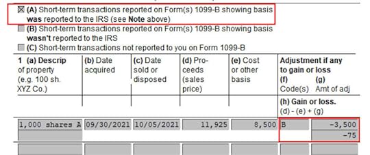 Enter a description. Enter the dates and numbers from the 1099-B form as they appear. Make sure to match the type of gain or loss reported on your 1099-B form. It was short-term on my form.