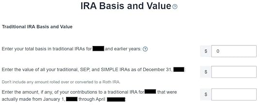 The box should be blank when you do a clean planned backdoor Roth. If you have other Traditional, SEP, or SIMPLE IRAs, add up the balances from your year-end statements and put the value here. The software will apply the pro-rata rule.