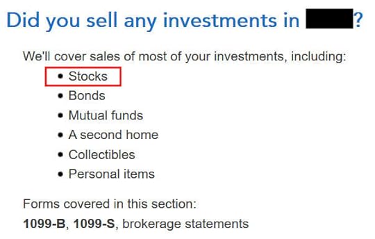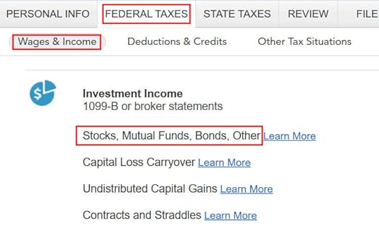 Go to “Federal Taxes” -> “Wages & Income” -> “Investment Income” and find “Stocks, Mutual Funds, Bonds, Other.”