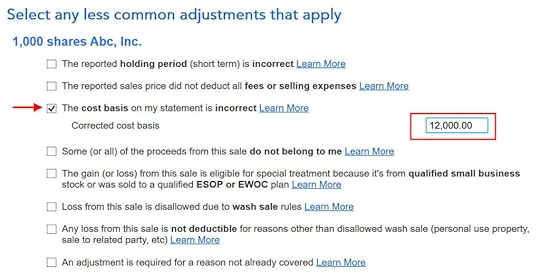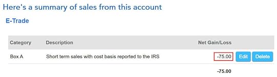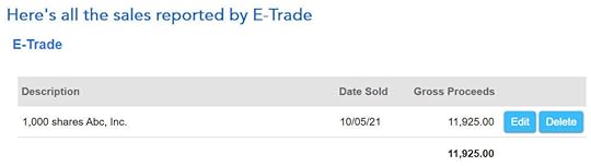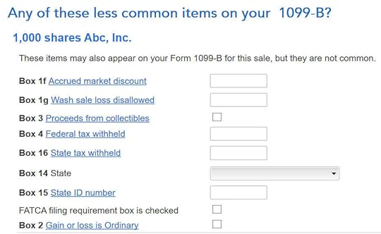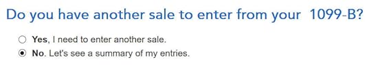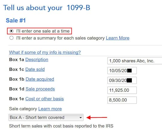 Choose to enter one sale at a time. Fill in the boxes from your 1099-B form. Look carefully at which category the sale belongs to on your 1099-B form. It was Box A on my form. It could be a different one on your form.