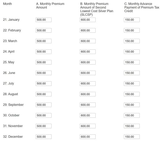 Enter the month-by-month numbers from your Form 1095-A. It’s tedious to repeat for all 12 months but TurboTax makes you do it. The first column is the full unsubsidized monthly premium for your plan. The middle column is the full unsubsidized premium of the second lowest-cost Silver plan, which is used to calculate your subsidy. The last column is the advance subsidy the ACA marketplace already paid on your behalf to the insurance company.