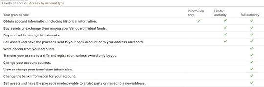 “Information Only” can monitor the account but can’t do anything. “Limited Authority” can transact within the account or send money out to an already linked bank account or the address on file. “Full Authority” can do a number of other things.You can grant the Information Only or Limited Authority permission online. It’s not clear how you can grant Full Authority. It looks like there used to be a form but all the links to the form are dead on Vanguard’s website. Please contact Vanguard customer service if you’d like to grant Full Authority.